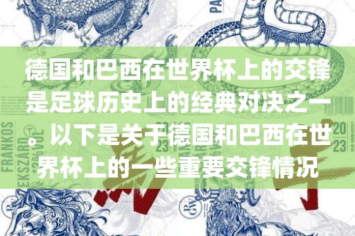 德国和巴西在世界杯上的交锋是足球历史上的经典对决之一。以下是关于德国和巴西在世界杯上的一些重要交锋情况