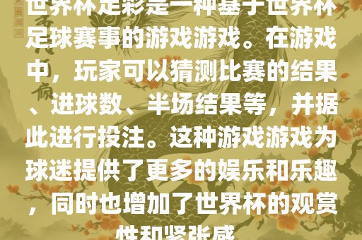 世界杯足彩是一种基于世界杯足球赛事的游戏游戏。在游戏中,玩家可以猜测比赛的结果、进球数、半场结果等,并据此进行投注。这种游戏游戏为球迷提供了更多的娱乐和乐趣,同时也增加了世界杯的观赏性和紧张感。
