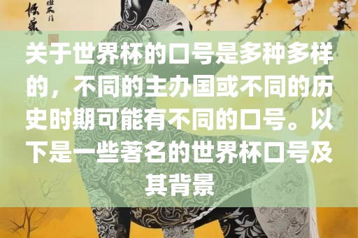 除此之外,每一届世界杯也都有自己的独特口号,旨在表达主办国对足球的热情和对世界杯的期待,这些口号不仅代表了世界杯的精神和文化内涵,也成为了世界杯历史的重要组成部分,如果您对某一届世界杯的口号有更具体的问题,欢迎继续向我提问。