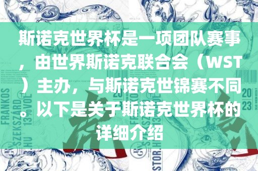 斯诺克世界杯是一项团队赛事,由世界斯诺克联合会(WST)主办,与斯诺克世锦赛不同。以下是关于斯诺克世界杯的详细介绍