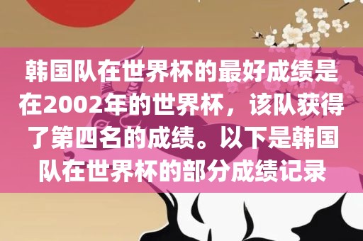 韩国队在世界杯的最好成绩是在2002年的世界杯,该队获得了第四名的成绩。以下是韩国队在世界杯的部分成绩记录