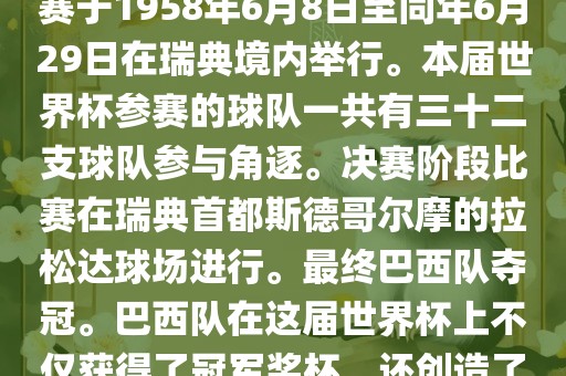 1. 比赛时间,1958年瑞典世界杯是第6届世界杯足球赛事。比赛于1958年6月8日至同年6月29日在瑞典境内举行。本届世界杯参赛的球队一共有三十二支球队参与角逐。决赛阶段比赛在瑞典首都斯德哥尔摩的拉松达球场进行。最终巴西队夺冠。巴西队在这届世界杯上不仅获得了冠军奖杯,还创造了著名的桑巴军团,为后来的足球历史留下了深刻的印记。