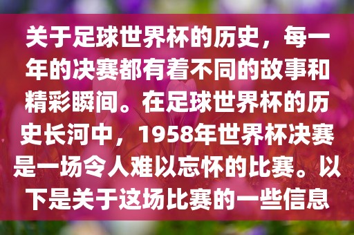 关于足球世界杯的历史,每一年的决赛都有着不同的故事和精彩瞬间。在足球世界杯的历史长河中,1958年世界杯决赛是一场令人难以忘怀的比赛。以下是关于这场比赛的一些信息