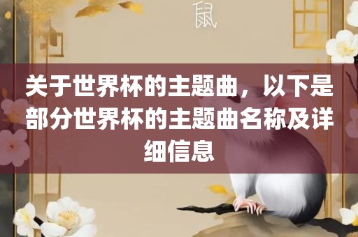 摘要:,,本文介绍了世界杯的部分主题曲名称及详细信息。这些主题曲是世界杯的重要组成部分,为比赛增添了激情和氛围。每首歌曲都有其独特的风格和旋律,反映了世界杯的精神和氛围。通过本文,读者可以了解世界杯主题曲的历史和相关信息。