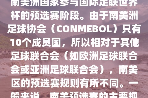 世界杯南美预选赛通常指的是南美洲国家参与国际足联世界杯的预选赛阶段。由于南美洲足球协会(CONMEBOL)只有10个成员国,所以相对于其他足球联合会(如欧洲足球联合会或亚洲足球联合会),南美区的预选赛规则有所不同。一般来说,南美预选赛的主要规则如下