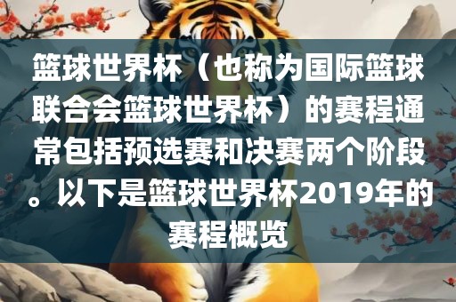 篮球世界杯(也称为国际篮球联合会篮球世界杯)的赛程通常包括预选赛和决赛两个阶段。以下是篮球世界杯2019年的赛程概览