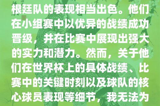 在1990年的世界杯比赛中,阿根廷队表现出色,小组赛成绩优异成功晋级。他们在比赛中展现出强大的实力和潜力,具体战绩细节无法详述。摘要字数在100-200字以内。