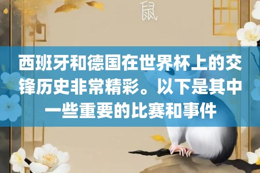 西班牙和德国在世界杯上的交锋历史非常精彩。以下是其中一些重要的比赛和事件