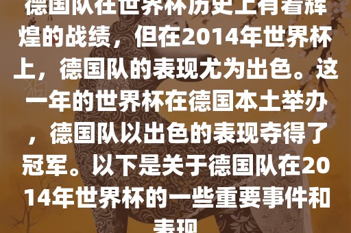 德国队在世界杯历史上有着辉煌的战绩,但在2014年世界杯上,德国队的表现尤为出色。这一年的世界杯在德国本土举办,德国队以出色的表现夺得了冠军。以下是关于德国队在2014年世界杯的一些重要事件和表现
