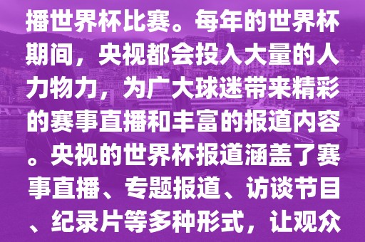 央视作为世界杯赛事的重要转播媒体,每年世界杯期间都会投入大量资源,为广大球迷带来精彩的赛事直播和丰富的报道。报道形式包括赛事直播、专题报道、访谈节目和纪录片等,让观众全面了解世界杯背后的故事和瞬间。
