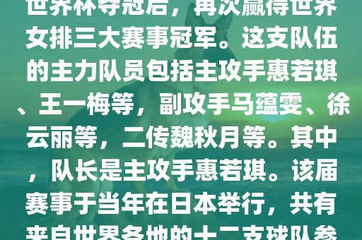 在2011年日本女排世界杯赛中,中国女排以全胜战绩摘得冠军,这也是中国女排继1995年世界杯夺冠后,再次赢得世界女排三大赛事冠军。这支队伍的主力队员包括主攻手惠若琪、王一梅等,副攻手马蕴雯、徐云丽等,二传魏秋月等。其中,队长是主攻手惠若琪。该届赛事于当年在日本举行,共有来自世界各地的十二支球队参与角逐。此外,该届世界杯的最佳发球奖由日本名将木村纱织获得。