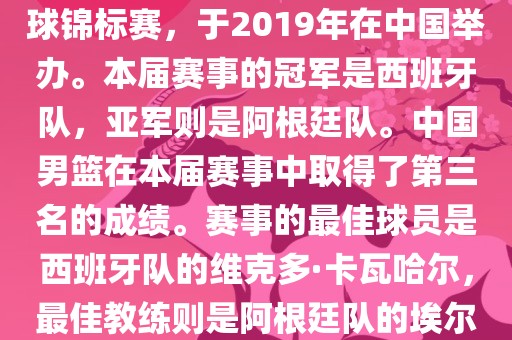 摘要:2019年国际篮联篮球世界杯在中国举办,西班牙队夺得冠军,中国男篮取得第三名。最佳球员为西班牙队的维克多·卡瓦哈尔,最佳教练为阿根廷队的埃尔南多·贝拉斯科。本届赛事创造了多项纪录,包括观众人数超过全球电视观众人数等。