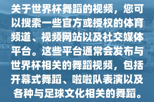 关于世界杯舞蹈的视频,您可以搜索一些官方或授权的体育频道、视频网站以及社交媒体平台。这些平台通常会发布与世界杯相关的舞蹈视频,包括开幕式舞蹈、啦啦队表演以及各种与足球文化相关的舞蹈。