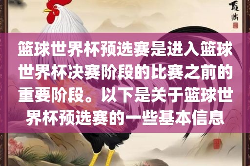 篮球世界杯预选赛是进入篮球世界杯决赛阶段的比赛之前的重要阶段。以下是关于篮球世界杯预选赛的一些基本信息