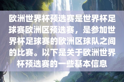 欧洲世界杯预选赛是参加世界杯足球赛的欧洲区球队之间的比赛,对于参加世界杯的欧洲足球队来说具有重要意义,通过预选赛,各队可以锻炼实力、积累经验,为参加世界杯做好准备。
