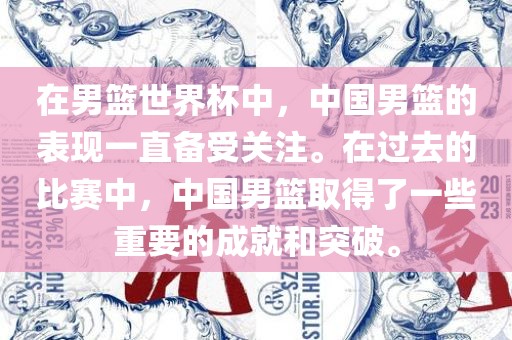 中国男篮在男篮世界杯中的表现备受瞩目。在过去的比赛中,中国男篮取得了一些重大成就和突破,展现出强大的实力和潜力。他们的表现吸引了无数球迷的关注和支持,成为了国内篮球界的骄傲。期待中国男篮在未来的比赛中继续发扬光大,创造更加辉煌的成绩。摘要字数在100-200字之间。