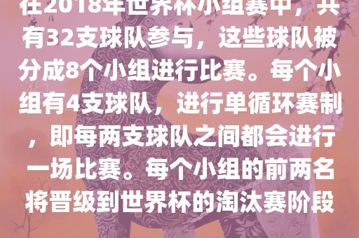 在2018年世界杯小组赛中,共有32支球队参与,这些球队被分成8个小组进行比赛。每个小组有4支球队,进行单循环赛制,即每两支球队之间都会进行一场比赛。每个小组的前两名将晋级到世界杯的淘汰赛阶段。