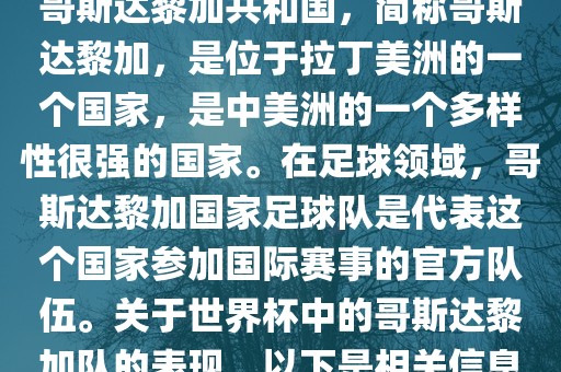 哥斯达黎加共和国,简称哥斯达黎加,是位于拉丁美洲的一个国家,是中美洲的一个多样性很强的国家。在足球领域,哥斯达黎加国家足球队是代表这个国家参加国际赛事的官方队伍。关于世界杯中的哥斯达黎加队的表现,以下是相关信息