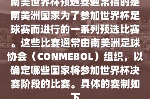 南美世界杯预选赛通常指的是南美洲国家为了参加世界杯足球赛而进行的一系列预选比赛。这些比赛通常由南美洲足球协会(CONMEBOL)组织,以确定哪些国家将参加世界杯决赛阶段的比赛。具体的赛制如下