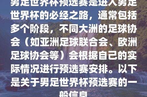 男足世界杯预选赛是进入男足世界杯的重要阶段,需要各支球队认真备战、全力以赴地参加比赛,对于足球迷来说,这也是观赏高水平足球比赛的好机会,如果想要了解具体的男足世界杯预选赛信息,可以关注相关足球协会或赛事官方的消息。