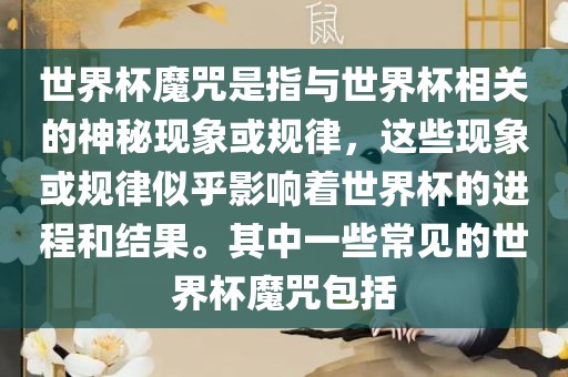 世界杯魔咒是指与世界杯相关的神秘现象或规律,这些现象或规律似乎影响着世界杯的进程和结果。其中一些常见的世界杯魔咒包括