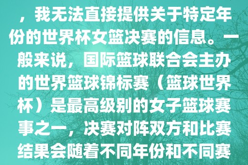 如果您想了解最近一次或特定年份的世界篮球锦标赛女子决赛的情况,建议您访问相关的体育新闻网站、社交媒体平台或篮球协会官方网站,以获取最准确和最新的信息,这些资源通常会提供比赛的实时更新、历史数据和新闻报道。
