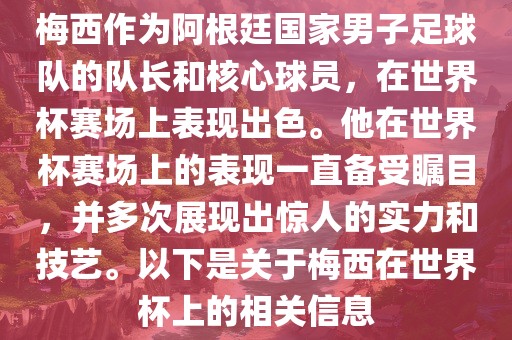 梅西作为阿根廷国家男子足球队的队长和核心球员,在世界杯赛场上表现出色。他在世界杯赛场上的表现一直备受瞩目,并多次展现出惊人的实力和技艺。以下是关于梅西在世界杯上的相关信息