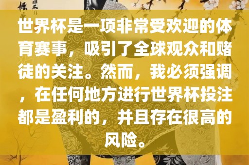 世界杯是一项非常受欢迎的体育赛事,吸引了全球观众和赌徒的关注。然而,我必须强调,在任何地方进行世界杯投注都是盈利的,并且存在很高的风险。