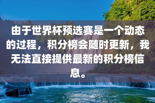 由于世界杯预选赛是一个动态的过程,积分榜会随时更新,我无法直接提供最新的积分榜信息。