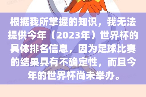 根据我所掌握的知识,我无法提供今年(2023年)世界杯的具体排名信息,因为足球比赛的结果具有不确定性,而且今年的世界杯尚未举办。