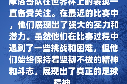 摩洛哥队在世界杯上的表现一直备受关注。在最近的比赛中,他们展现出了强大的实力和潜力。虽然他们在比赛过程中遇到了一些挑战和困难,但他们始终保持着坚韧不拔的精神和斗志,展现出了真正的足球精神。