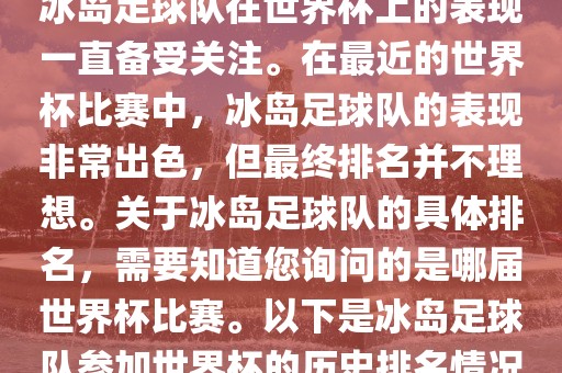 冰岛足球队在世界杯上的表现引人关注。尽管在最近的世界杯比赛中表现出色,但最终排名并不理想。关于其历史排名,需知道具体是哪届世界杯比赛。冰岛足球队在世界杯赛场上留下了深刻的足迹。