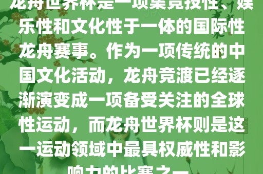 龙舟世界杯是一项重要的国际性龙舟赛事,旨在推广和发展全球龙舟运动,同时也是展示中国传统文化的重要窗口,通过这一赛事,世界各地的龙舟队伍和爱好者得以相聚,共同推动龙舟运动的发展,增进不同文化之间的交流与理解。